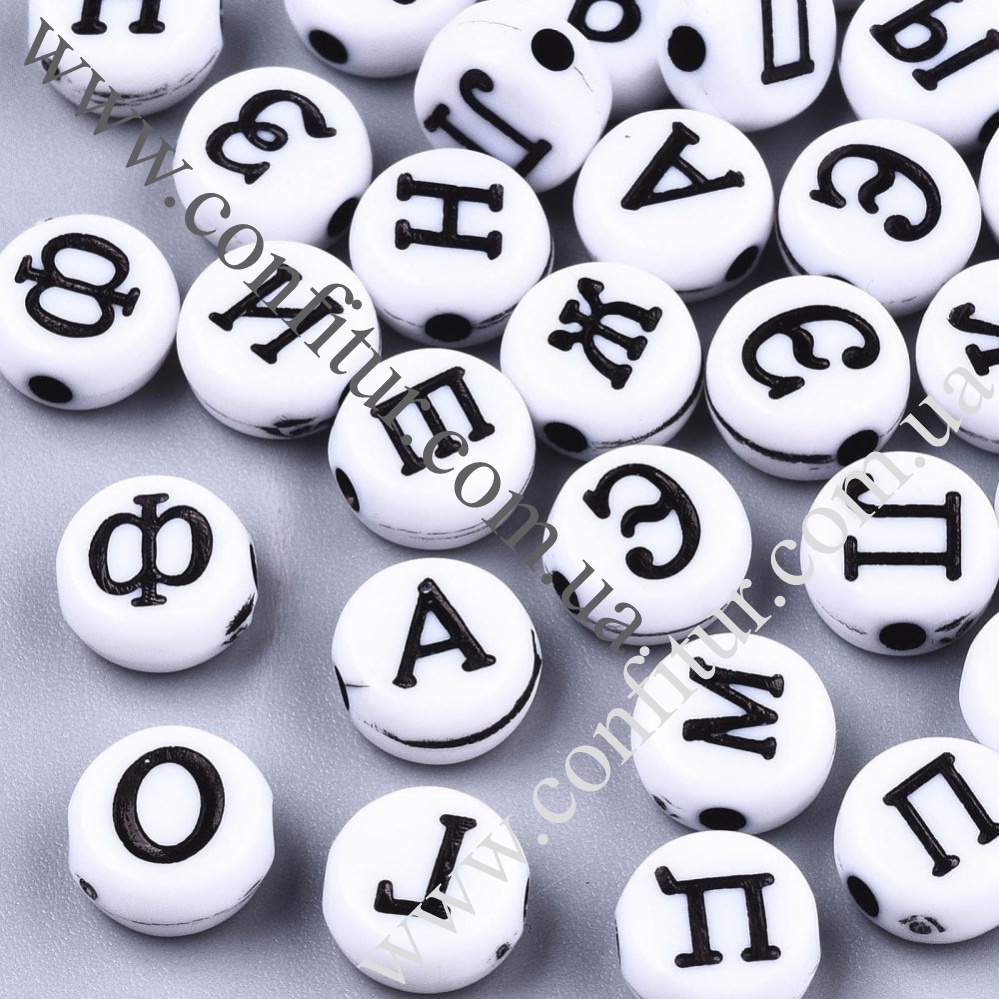 Бусины 7*4 мм Акрил микс русские буквы плоско-круглые черные, отв. 1,5 мм. В продаже по-штучно и упаковками. Идеально подойдет для Ваших творческих идей.